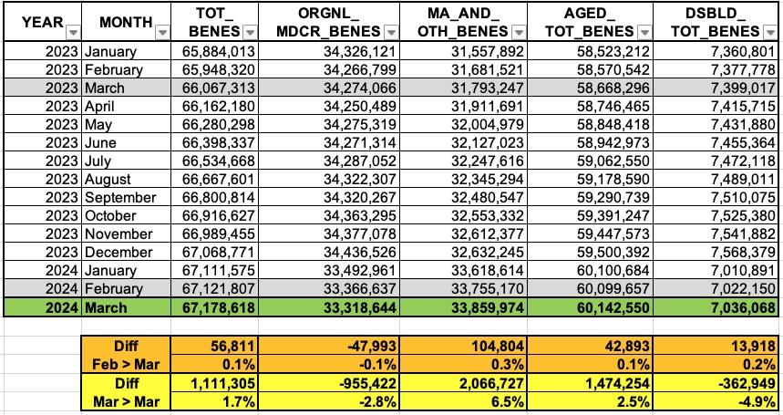 • Total Medicare beneficiaries reached 67,178,618...up just 56,811 from March