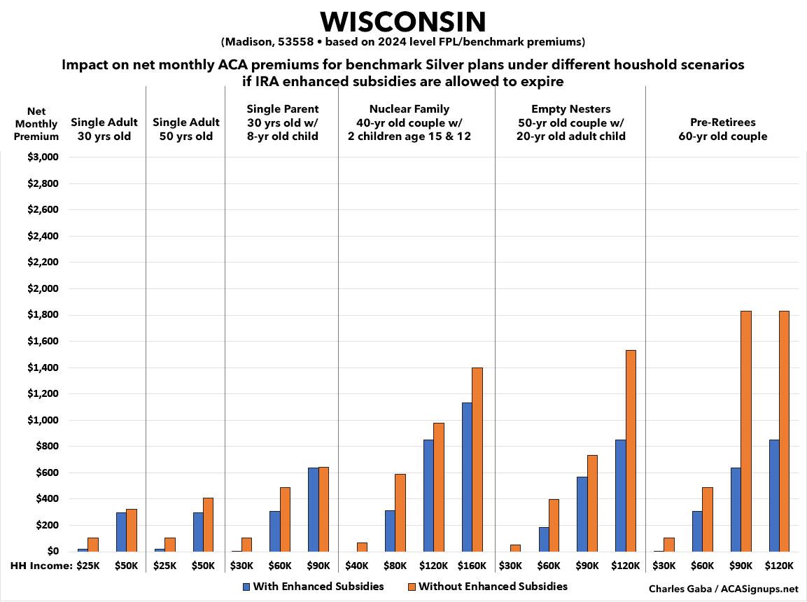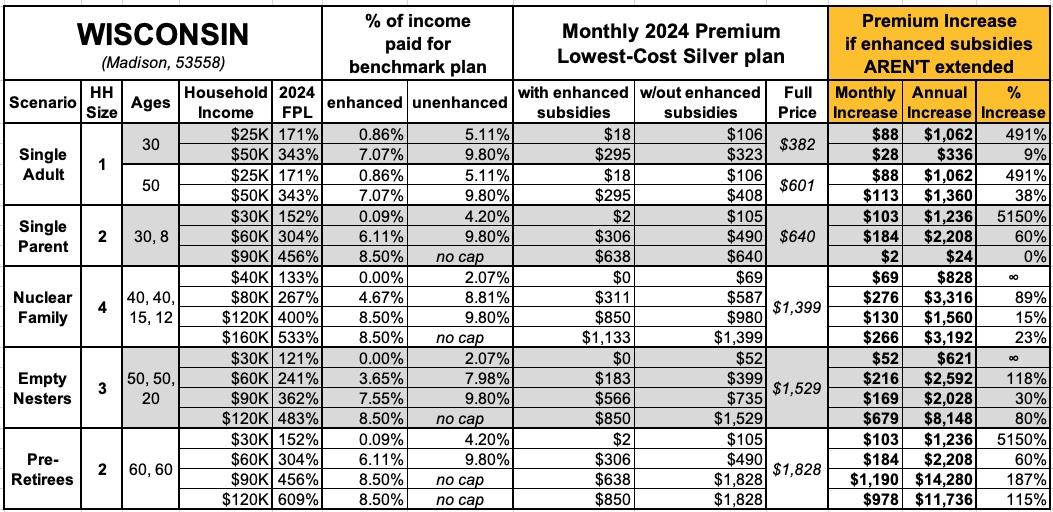 That's the macro level, however. As I did a couple of years ago when the subsidies were originally at risk of expiring in 2023, I decided to run the numbers myself to get an idea of just how much enrollees real-world health insurance premiums would go up in the event the ARPA/IRA subsidies are indeed allowed to expire at the end of next year.