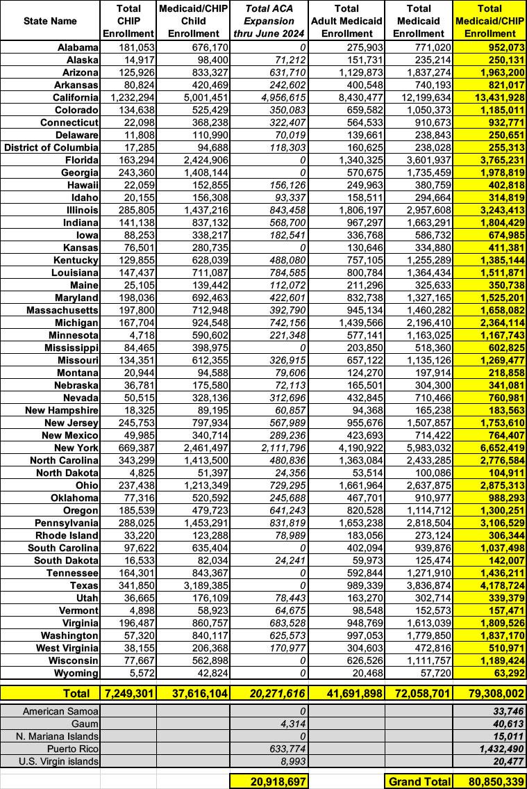 The all-time high enrollment watermark for Medicaid/CHIP was in April 2023, when it officially hit 94.1 million Americans (possibly as high as 95.7 million if you include the U.S. territories).
