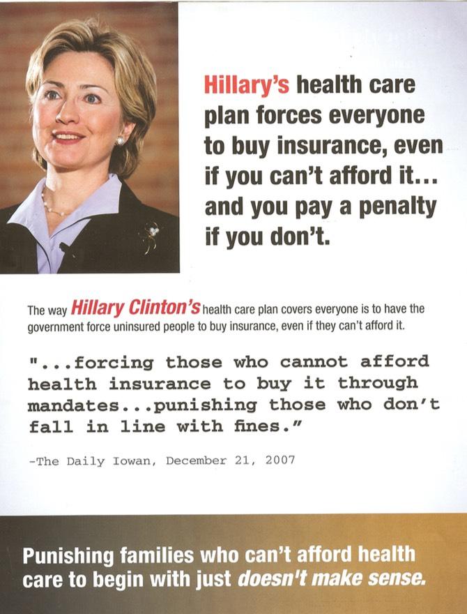 Shoutout to James Medlock for digging up this relic from the 2008 Presidential primariy race: A lit piece from then-Senator Barack Obama's campaign slamming then-Senator Hillary Clinton over her insistence on her proposed healthcare policy bill including an Individual Mandate Penalty. How many Republican talking points can you spot below?