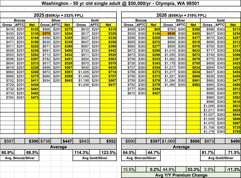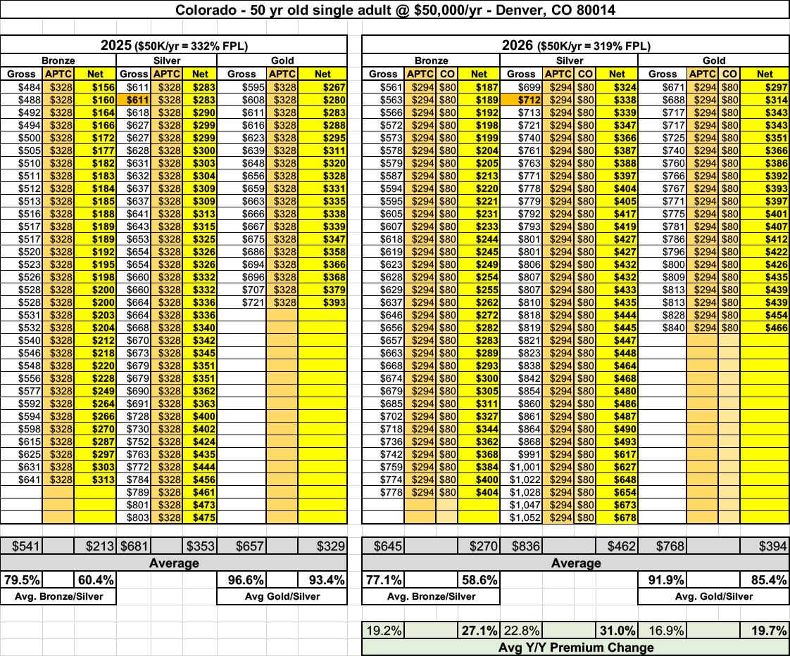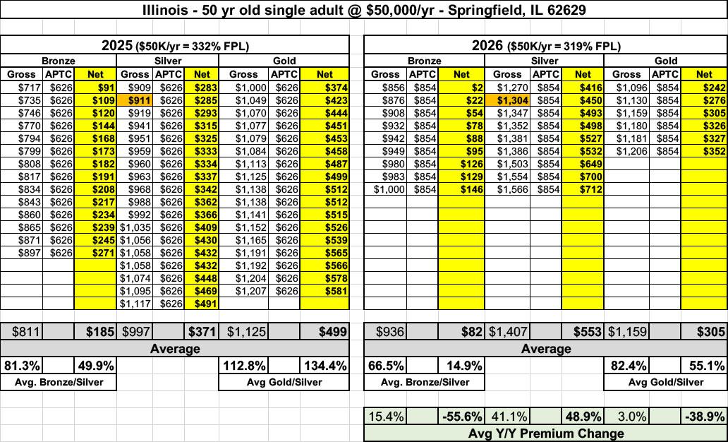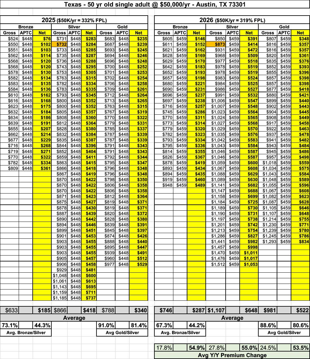 Therefore, I'm again focusing on the 200 - 400% FPL income bracket: A single 50-yr old adult earning $50,000/year, which is 332% FPL in 2025 and will be 319% FPL in 2026.
