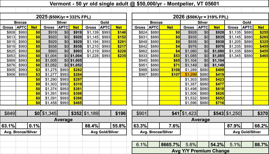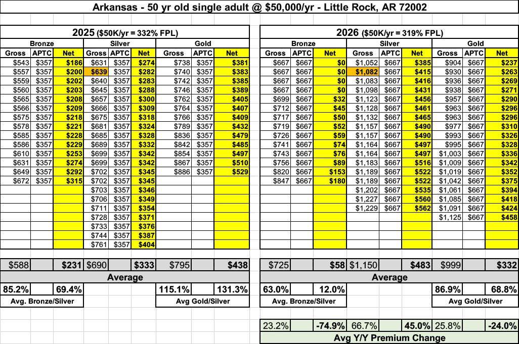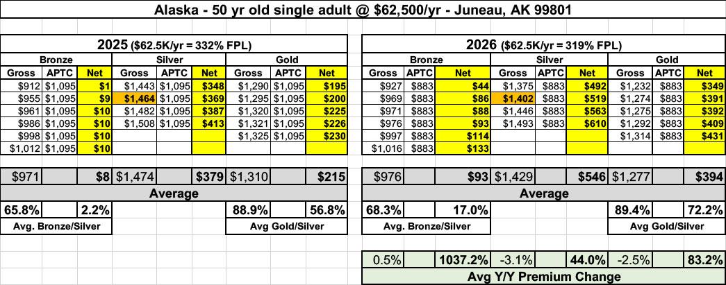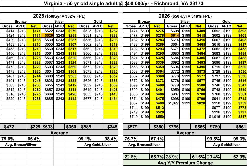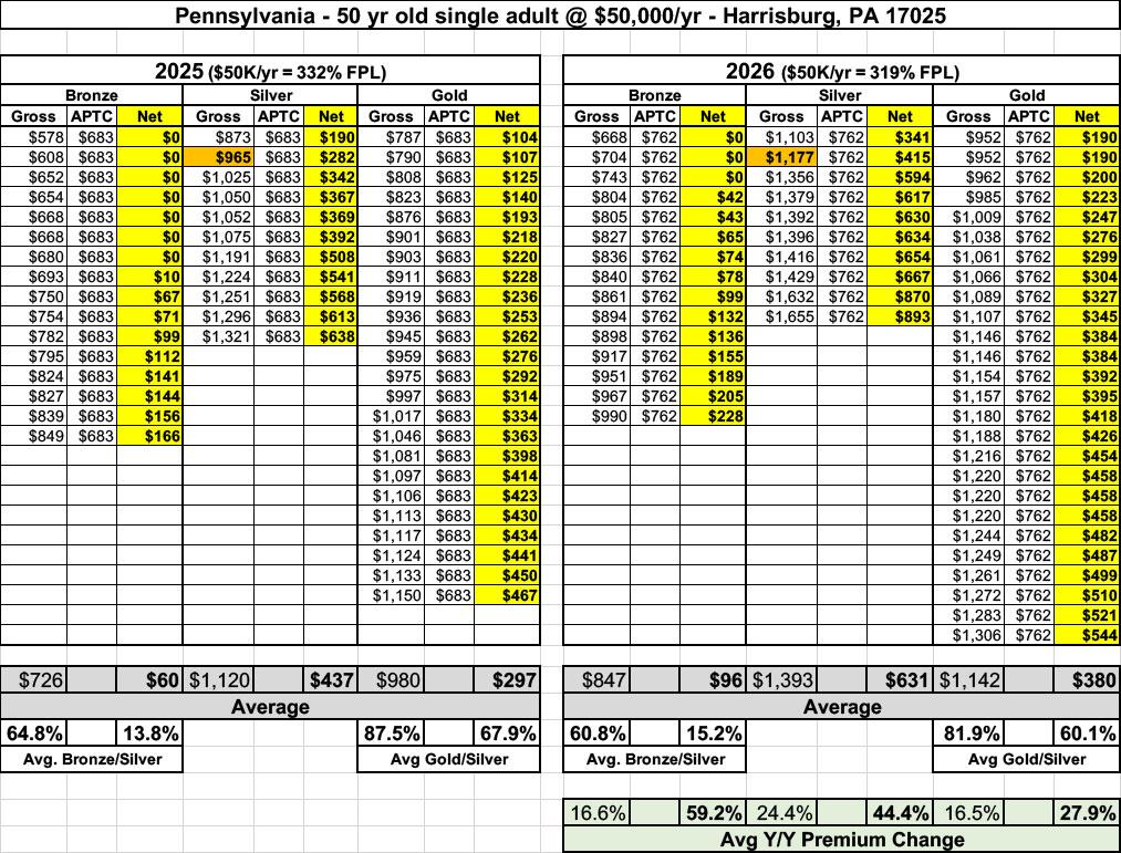 Therefore, I'm again focusing on the 200 - 400% FPL income bracket: A single 50-yr old adult earning $50,000/year, which is 332% FPL in 2025 and will be 319% FPL in 2026.