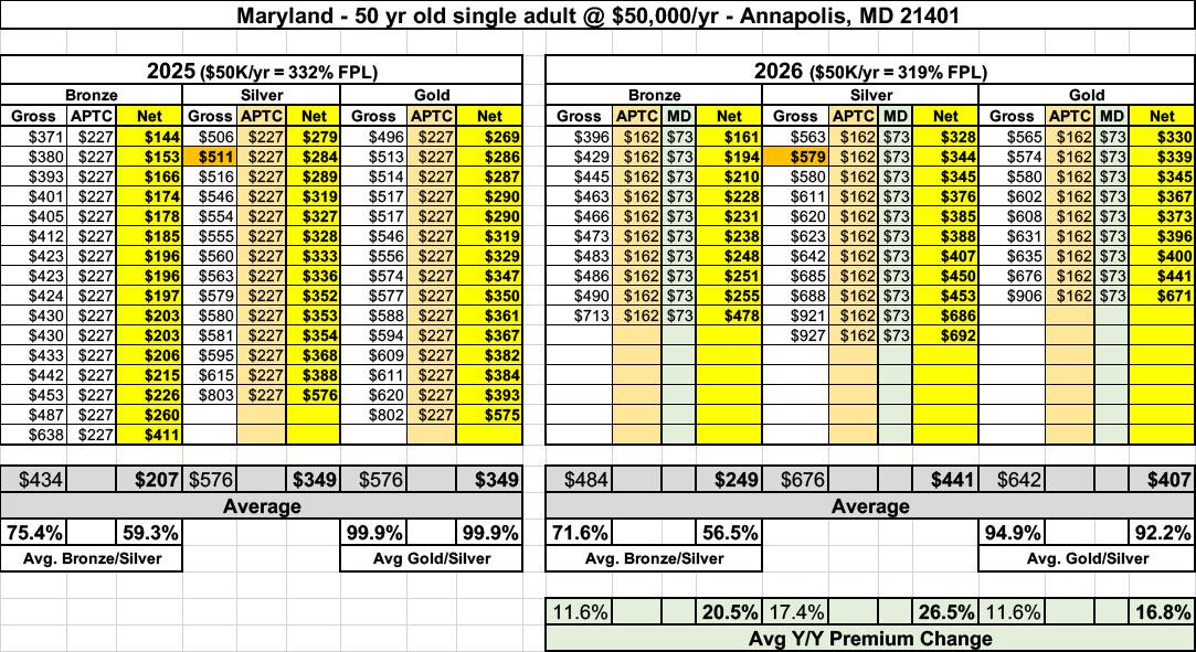 Maryland is another state which is continuing to implement Premium Alignment pricing. It's not super aggressive but is stronger than Colorado's...and like Colorado, Maryland has their own state-based subsidy program which is knocking an additional $73/month off the net premium.