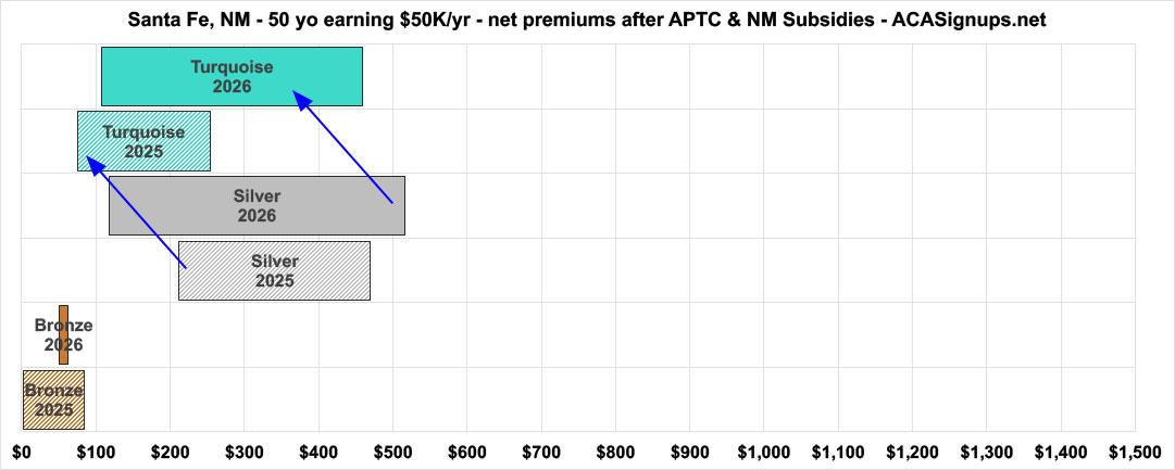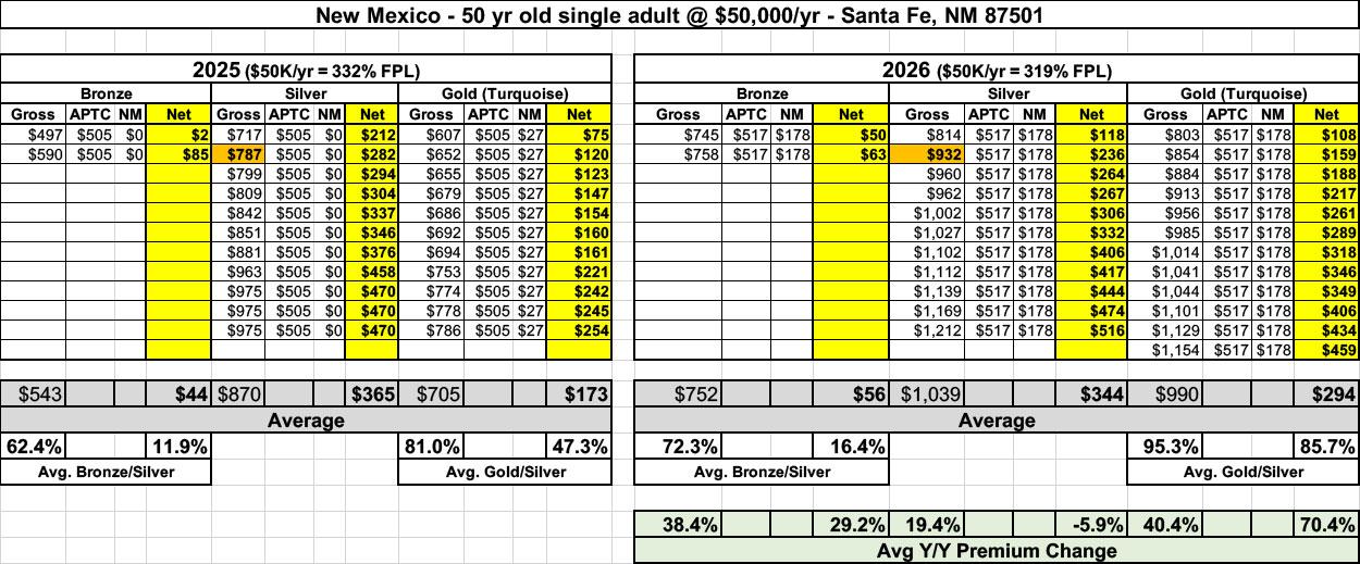 Oddly, the net impact of all of this is that the only 2 Bronze plans available in Santa Fe would cost either more or less in 2026 than in 2025, which is a bit odd I admit.