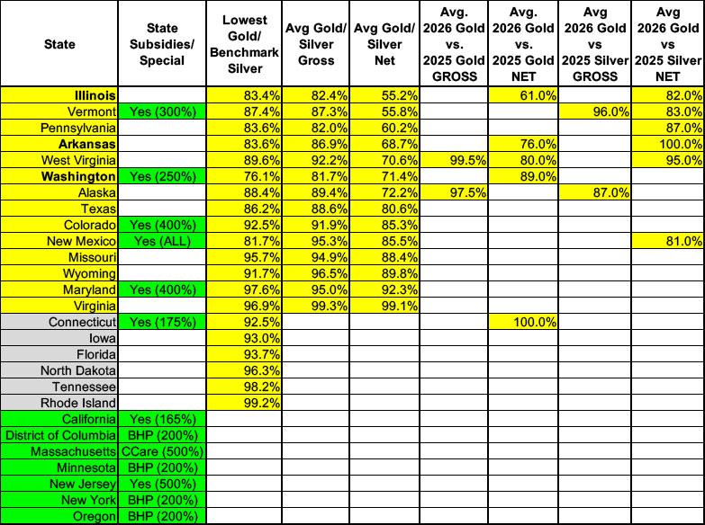 I also found several of them where the Gold plans will cost less on average in 2026 than in 2025, and even some where the average Gold plan will cost less than the average Silver plan does this year.