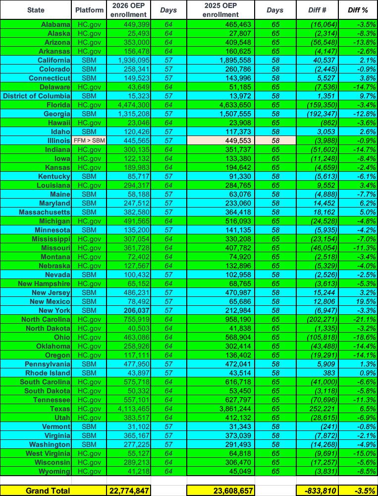 Breaking: CMS posts claimed 2026 Open Enrollment: 22.8M QHPs, down 3.5% y/y so far
