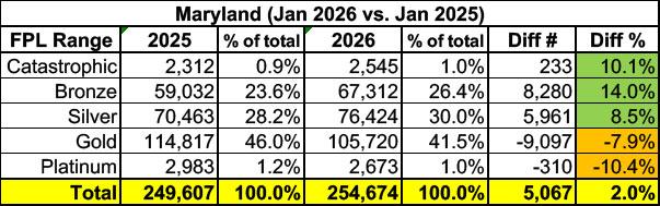 Maryland saw fariiy modest "buying down" this year, likely due in large part to them backfilling 100% of lost tax credits for enrollees earning up to 200% FPL (~32% of all enrollees) and 50% of it for enrollees earning 200 - 400% FPL (another ~33% of all enrollees).