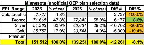 Minnesota saw massive "buying down" from Gold and Silver to Bronze (presumably mitigated somewhat by Catastrophic plans having little choice but to move to Bronze due to Catastrophic plans not being available this year).