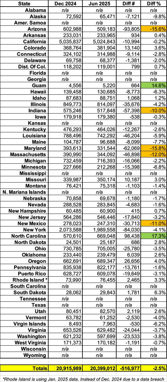 According to the new report, total enrollment from December 2024 through June 2025 dropped by 517,000 people, or roughly 2.5%, standing at 20.4 million nationally as of last June, so it doesn't look like the Trump Admin has started cooking these particular books, at least not yet.
