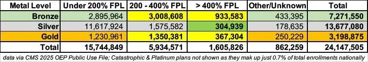 Here’s a breakout of 2025 ACA exchange enrollment by metal level and income bracket: