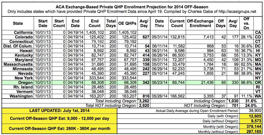 Oregon continues to rack up impressive QHP numbers, although their daily average is definitely slowing down as we move farther from their "extended-extension period". Even so, their net enrollments are still up another 1,258 since 6/24, while Medicaid enrollment has gone up just 1,221. My suspicion for the Medicaid enrollment drop-off (also noted by contributor deaconblues) is that they've simply run out of Medicaid-eligible people in the state...which makes sense seeing how they've added 355K people to the program since January (227K via the exchange + another 128K via their "fast track" program), when the Kaiser Family Foundation estimated that there were only 260,000 uninsured people even eligible for Medicaid to begin with!