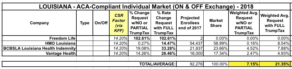 Louisiana has 3 individual market carriers for 2018 (technically there's 4, but "Freedom Life" is basically just a shell company with a placeholder filing). Officially, they're requesting average rate increases averaging around 21.4%...but all three carriers state point-blank in their filing letters that a huge chunk of their request is due specifically to the CSR reimbursement and mandate enforcement issues. The Kaiser Family Foundation estimates the CSR issue alone adds around 20 points to Silver plans, and 71% of Louisiana exchange enrollees chose Silver, so that translatest into roughly 14.2 points across the whole market. This results in just a 7.2% average rate hike if CSR payments are made vs. 21.4% if they aren't:
