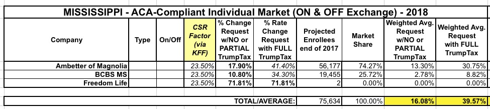 There's only two carriers participating in Mississippi's individual market next year (plus Freedom Life, which once again is just a shell company here). They're asking for 16.1% average rate hikes, and since there's no mention in any of the filings about CSR payments not being made or the mandate not being enforced, I'm assuming that increase doesn't account for those factors.