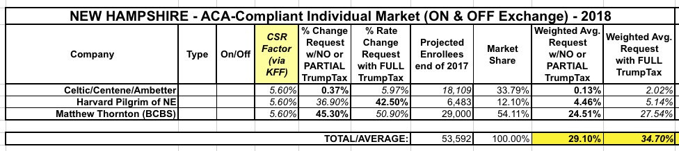 New Hampshire's a bit of a head-scratcher this year: Of the three carriers on the individual exchange next year (each of whcih has a significant chunk of the market), Centene is requesting virtually no rate increases whatsoever...while the other two are asking to raise their rates by over 40% apiece.