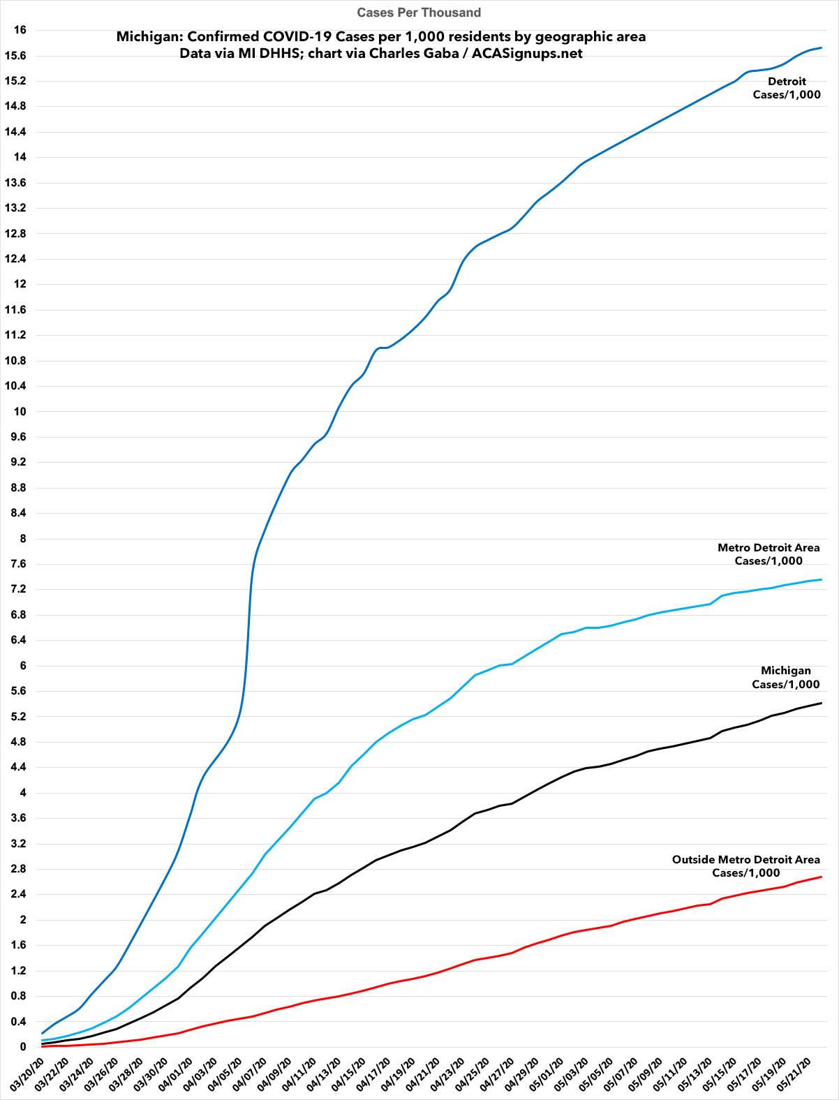 As a follow-up to my prior posts about the urban/rural divide of how COVID-19 has spread throughout Michigan, here's a graph which shows how it's spread in Detroit, the larger Metro Detroit area and the rest of the state on a per capita basis over time.
