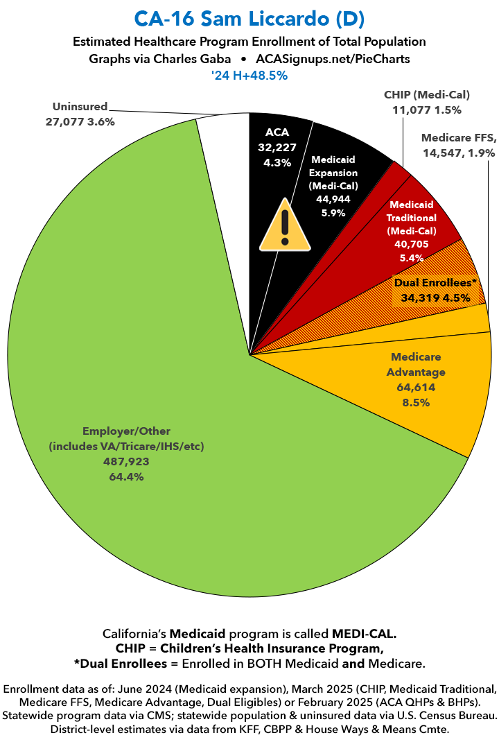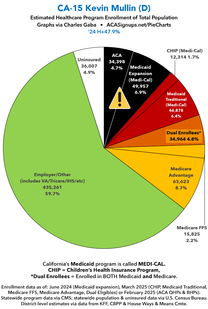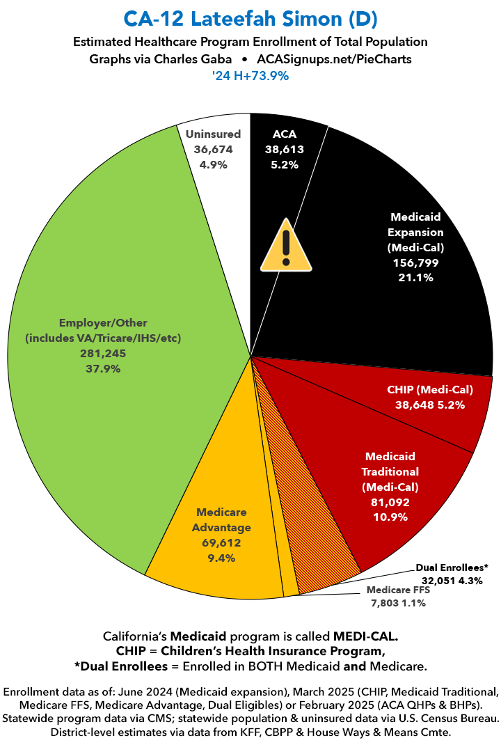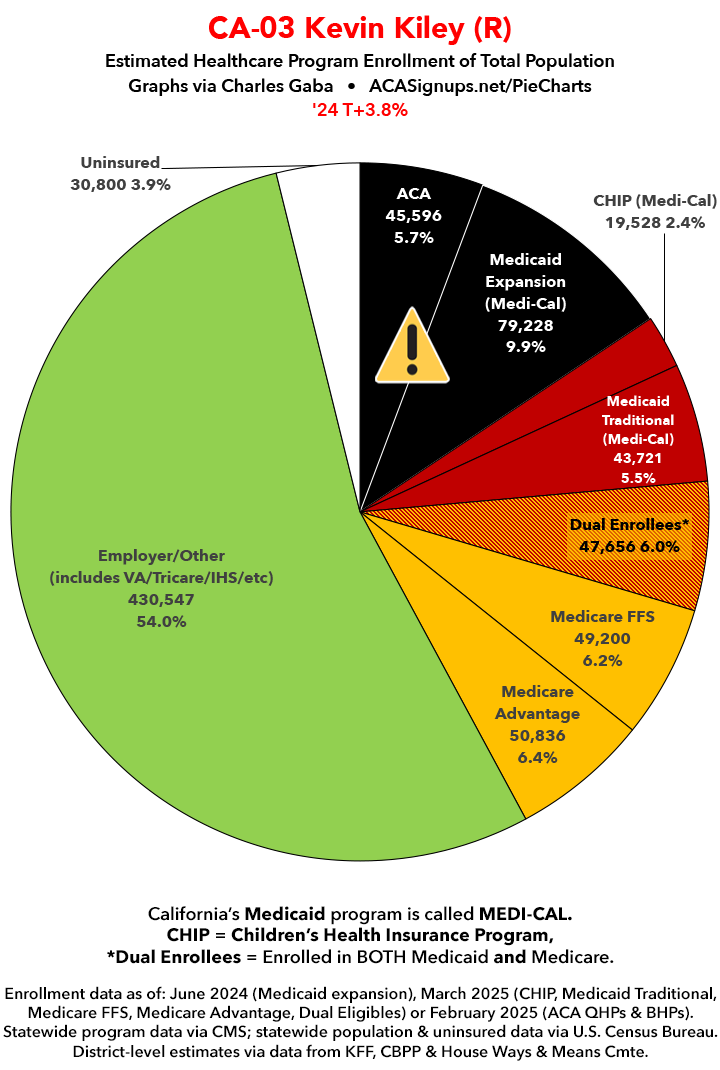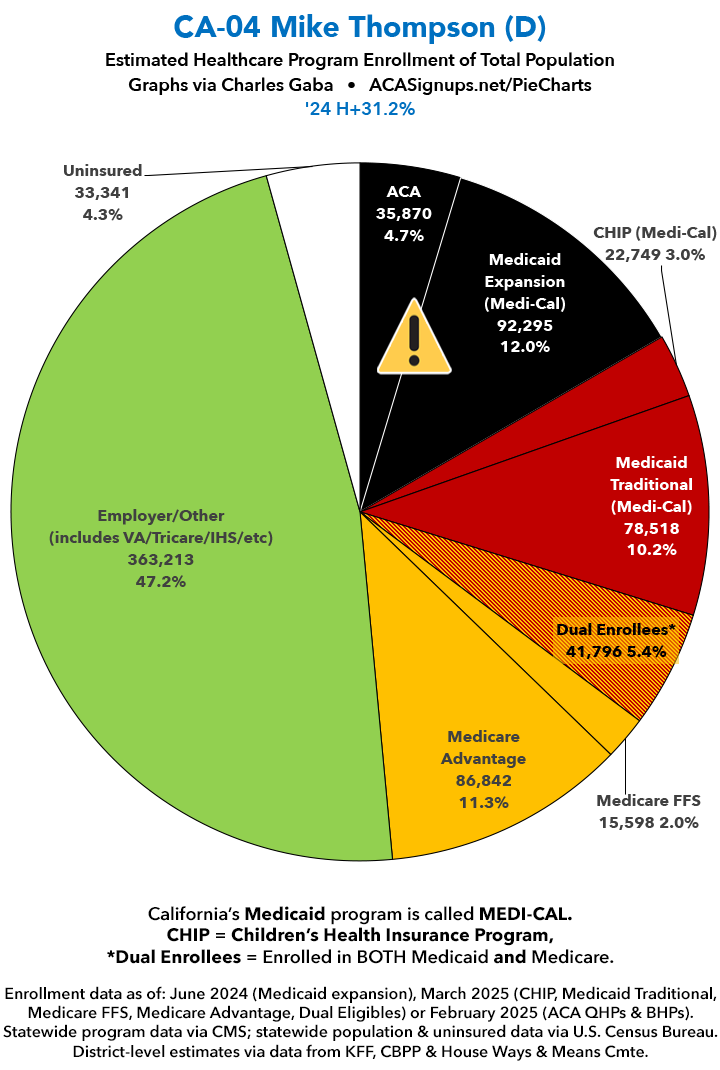 UPDATE 7/1/25: I've updated the web versions of the graphics with the most up-to-date enrollment data I have access to. The black sections w/the ⚠️ symbol are those most at risk of losing healthcare coverage due to H.R. 1, the "One Big Beautiful Bill Act" (aka the #MAGAMurderBill).