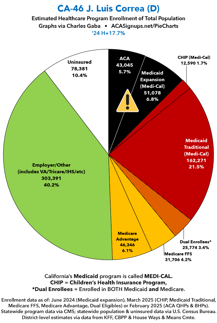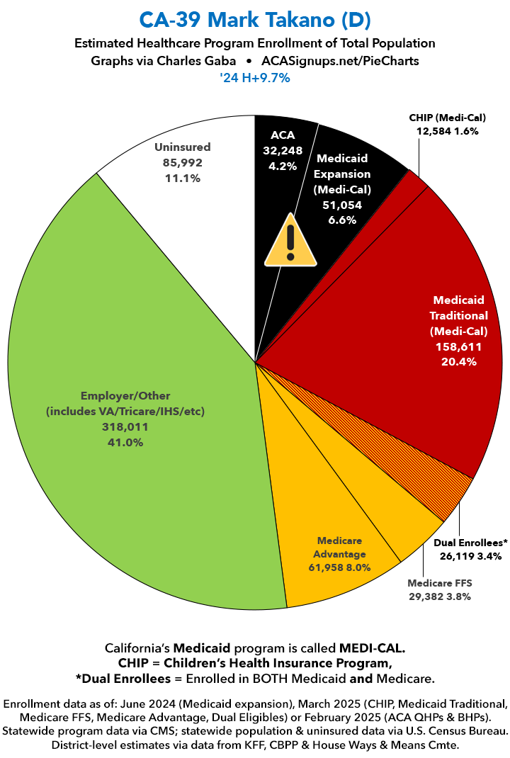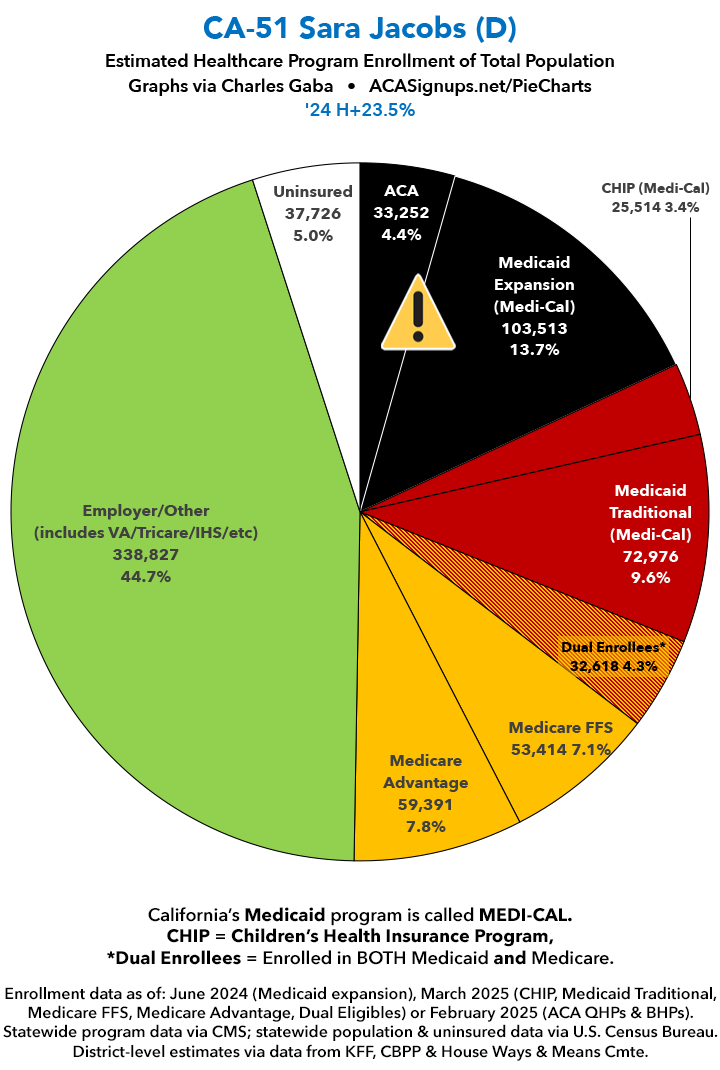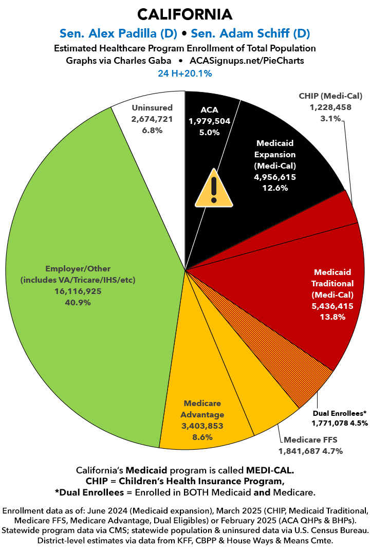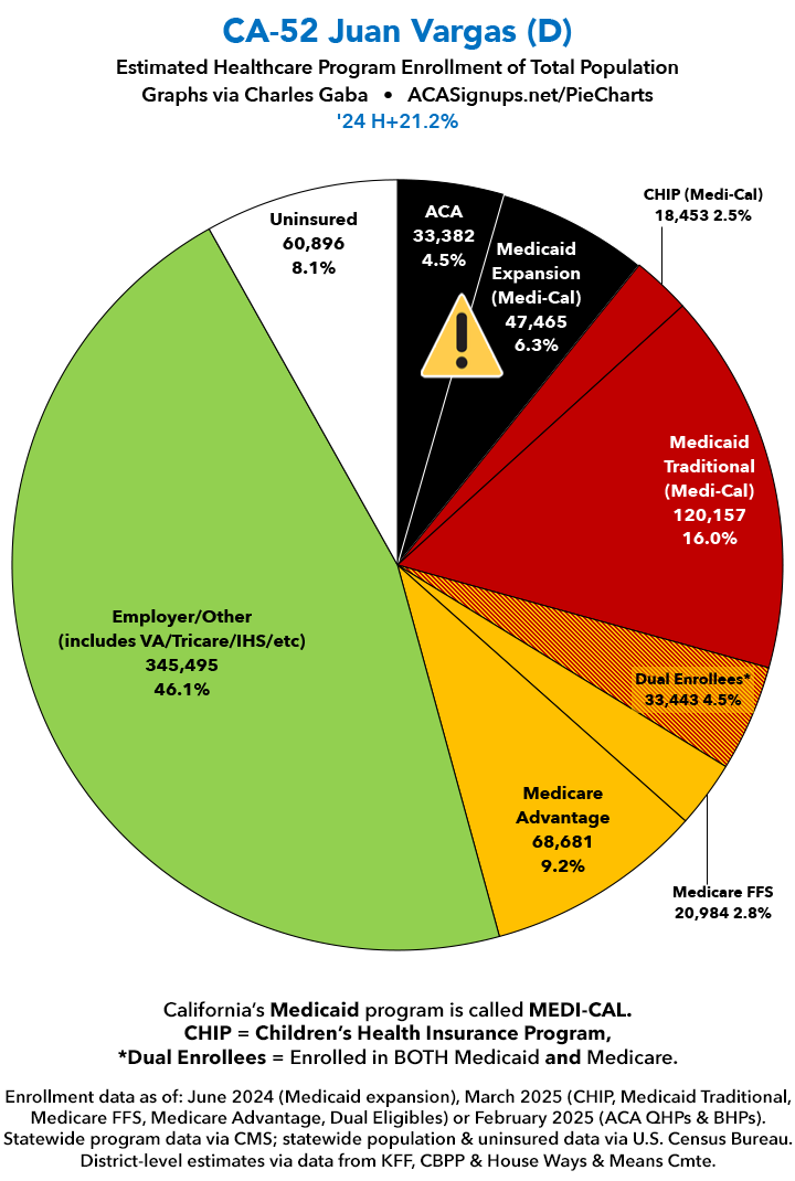 UPDATE 7/2/25: I've updated the web versions of the graphics with the most up-to-date enrollment data I have access to. The black sections w/the ⚠️ symbol are those most at risk of losing healthcare coverage due to H.R. 1, the "One Big Beautiful Bill Act" (aka the #MAGAMurderBill).