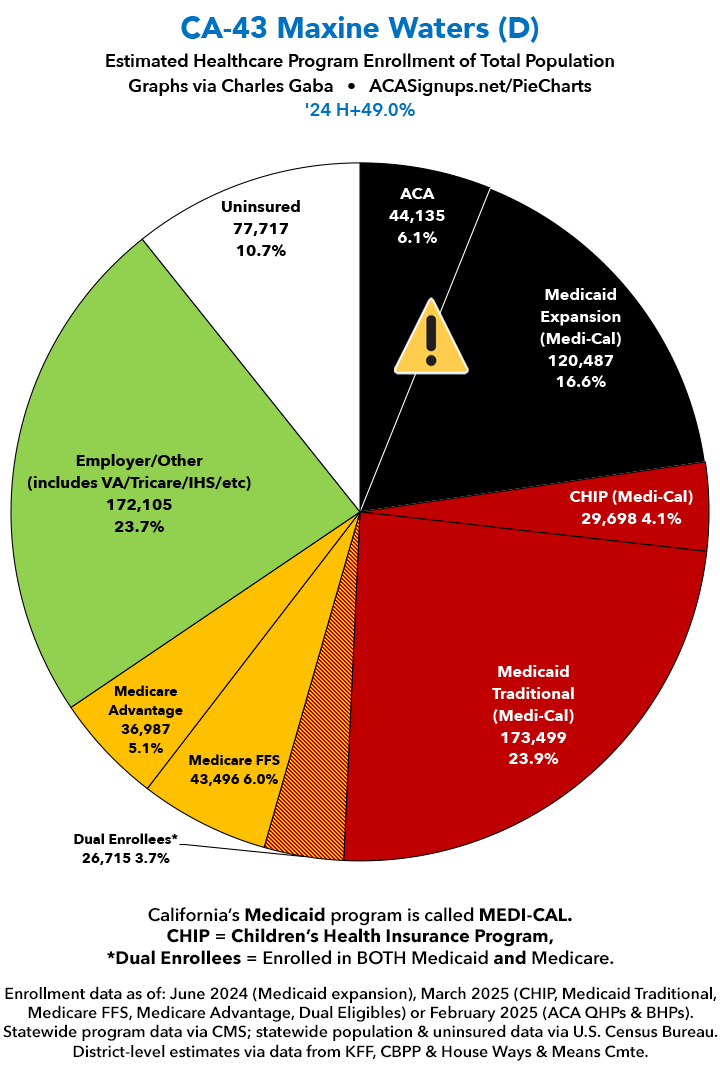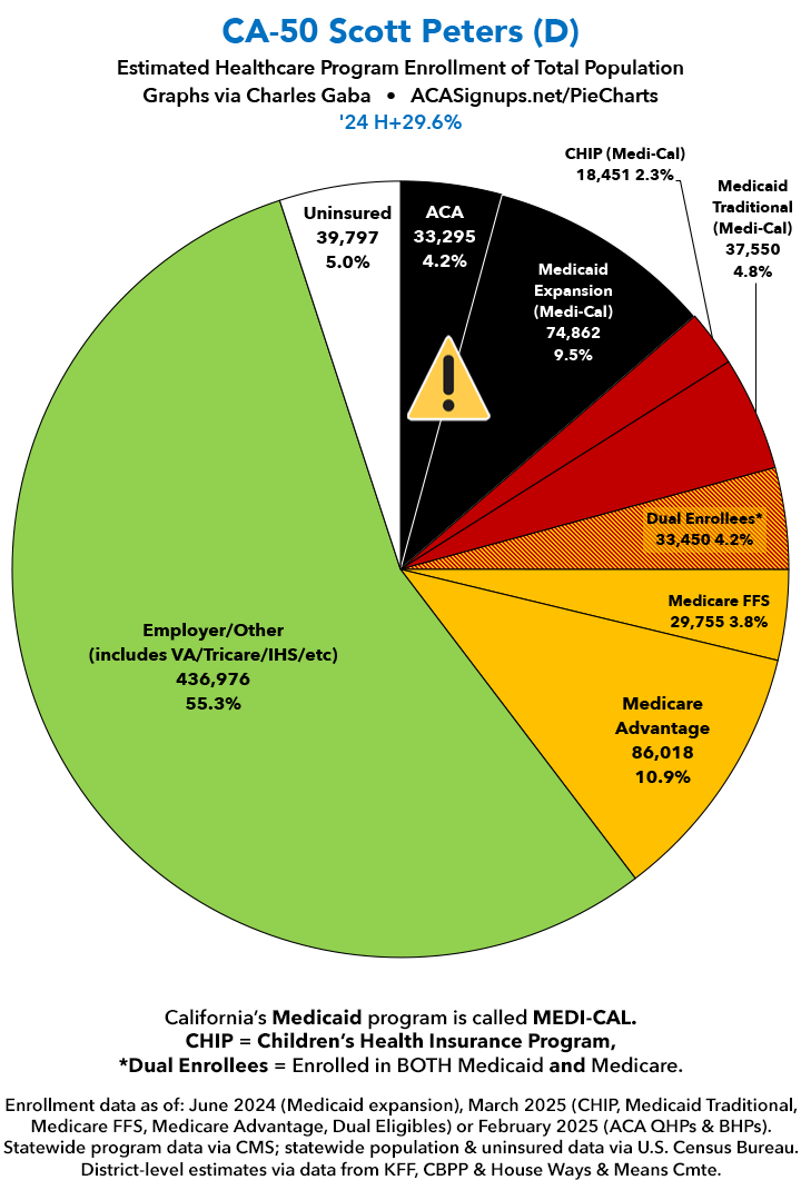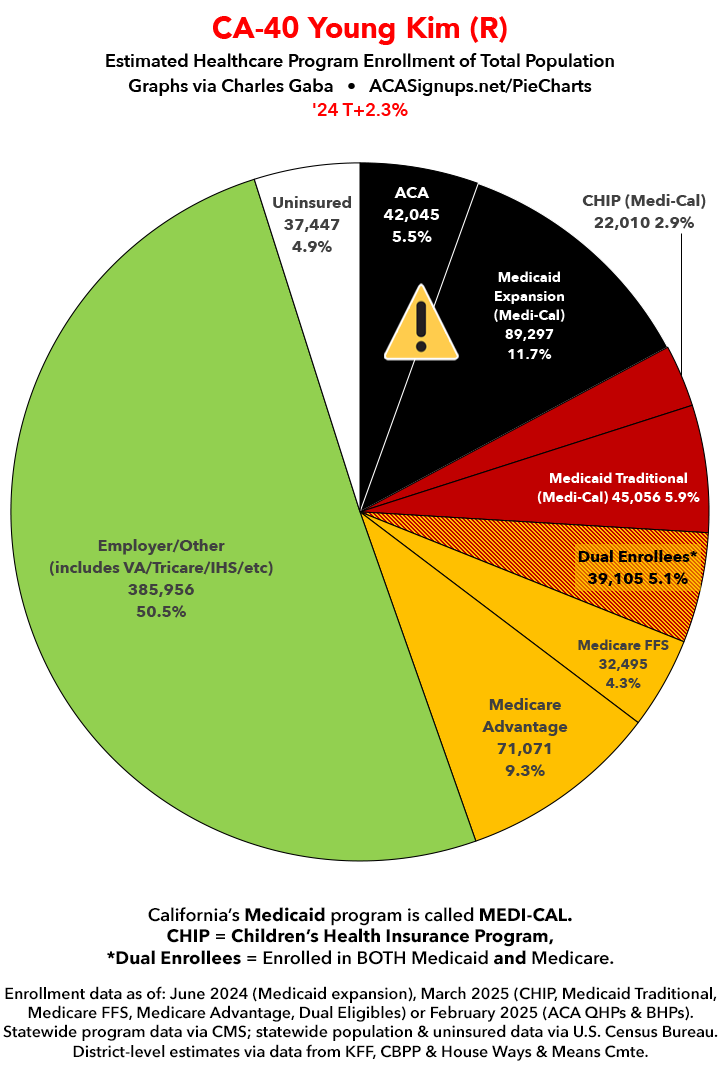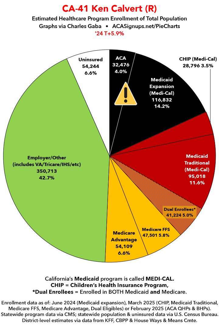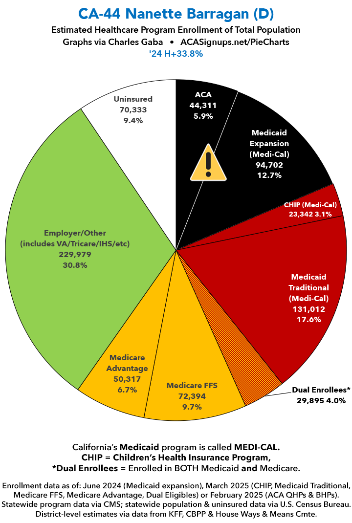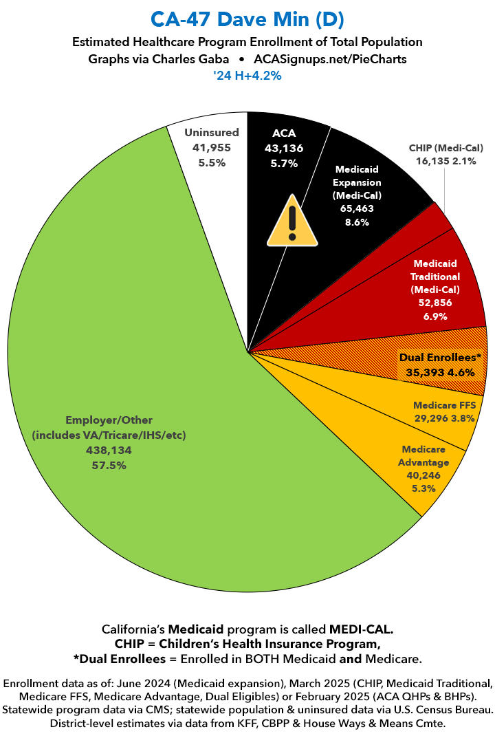UPDATE 7/2/25: I've updated the web versions of the graphics with the most up-to-date enrollment data I have access to. The black sections w/the ⚠️ symbol are those most at risk of losing healthcare coverage due to H.R. 1, the "One Big Beautiful Bill Act" (aka the #MAGAMurderBill).