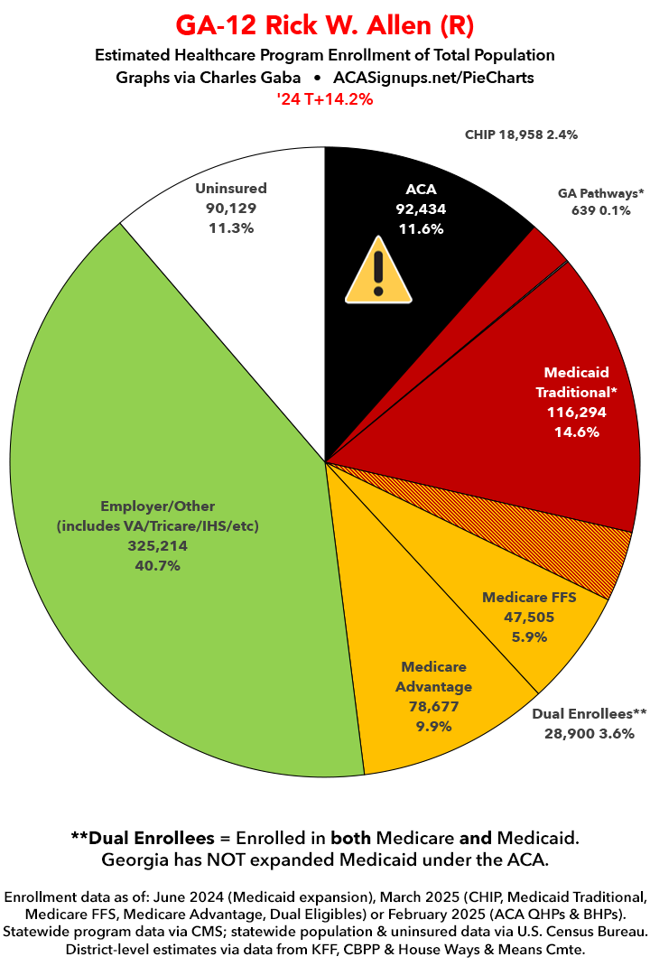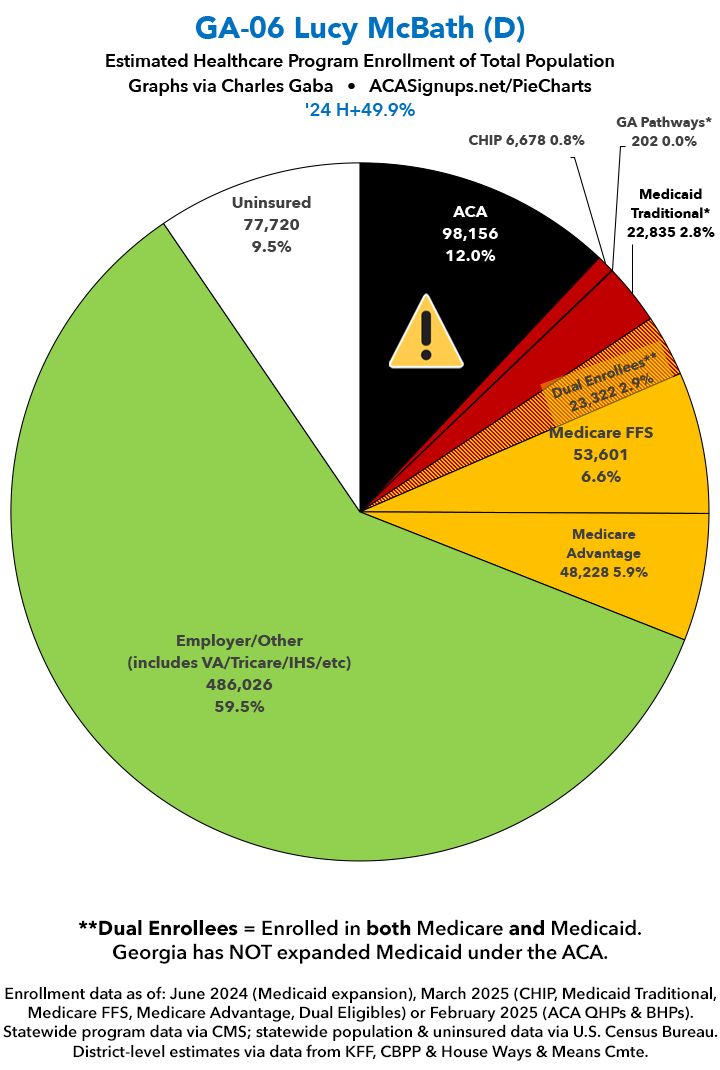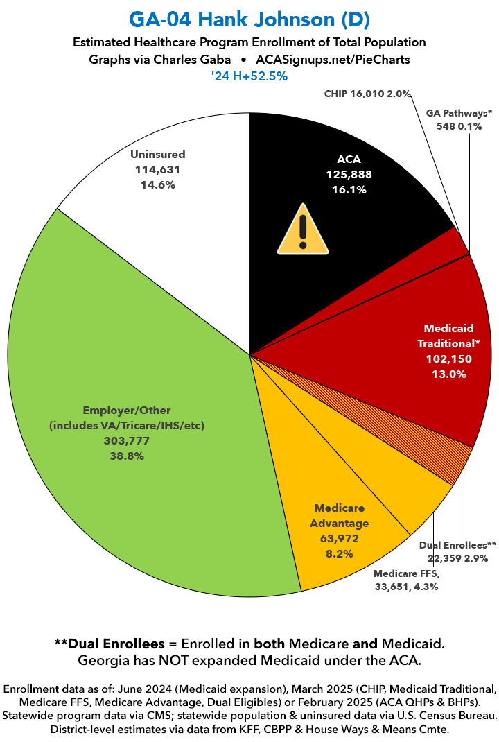 UPDATE 7/3/25: I've updated the web versions of the graphics with the most up-to-date enrollment data I have access to. The black sections w/the ⚠️ symbol are those most at risk of losing healthcare coverage due to H.R. 1, the "One Big Beautiful Bill Act" (aka the #MAGAMurderBill).