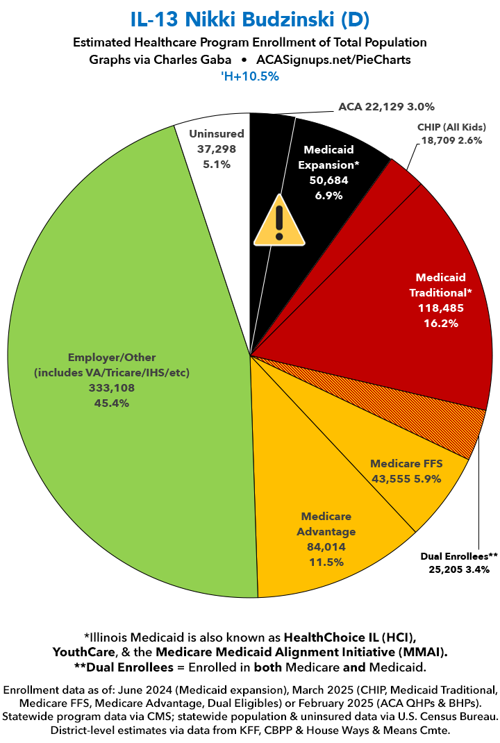UPDATE 7/3/25: I've updated the web versions of the graphics with the most up-to-date enrollment data I have access to. The black sections w/the ⚠️ symbol are those most at risk of losing healthcare coverage due to H.R. 1, the "One Big Beautiful Bill Act" (aka the #MAGAMurderBill).