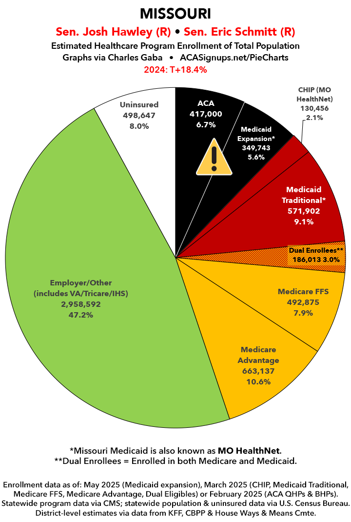 UPDATE 7/6/25: I've updated the web versions of the graphics with the most up-to-date enrollment data I have access to. The black sections w/the ⚠️ symbol are those most at risk of losing healthcare coverage due to H.R. 1, the "One Big Beautiful Bill Act" (aka the #MAGAMurderBill).