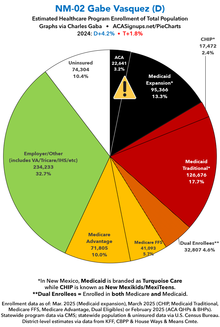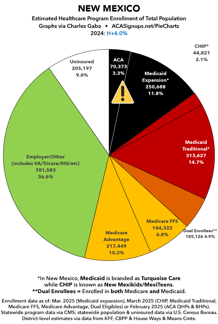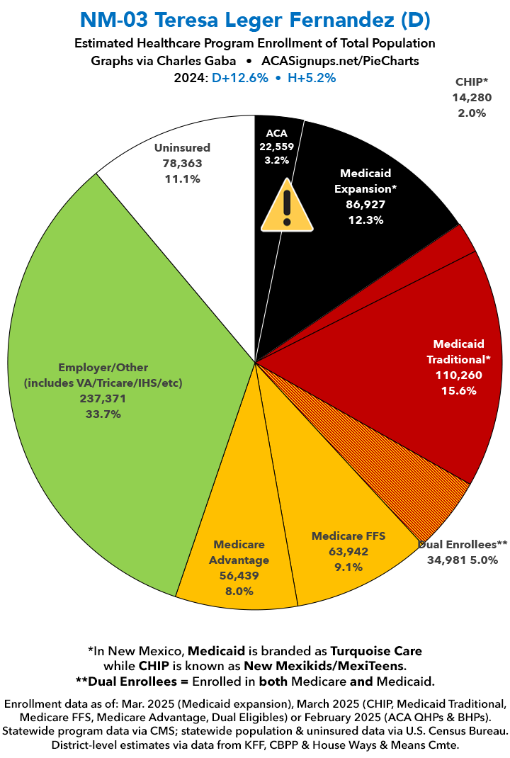 UPDATE 7/16/25: I've updated the web versions of the graphics with the most up-to-date enrollment data I have access to. The black sections w/the ⚠️ symbol are those most at risk of losing healthcare coverage due to H.R. 1, the "One Big Beautiful Bill Act" (aka the #MAGAMurderBill).