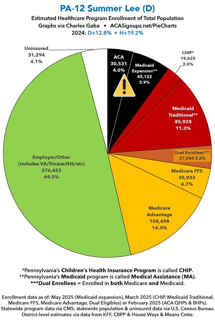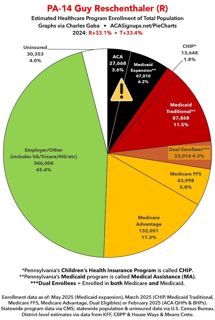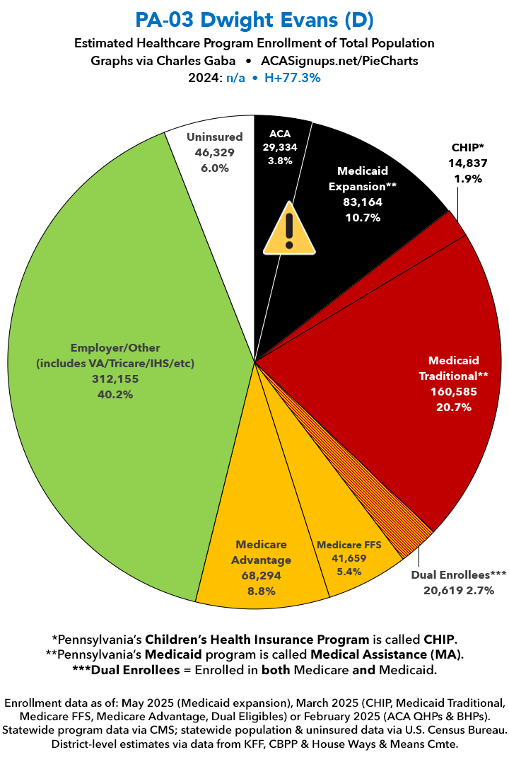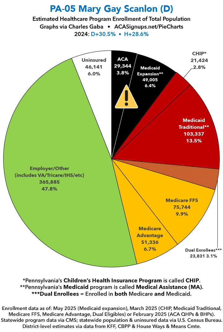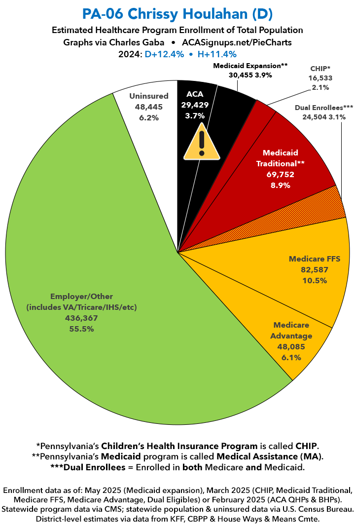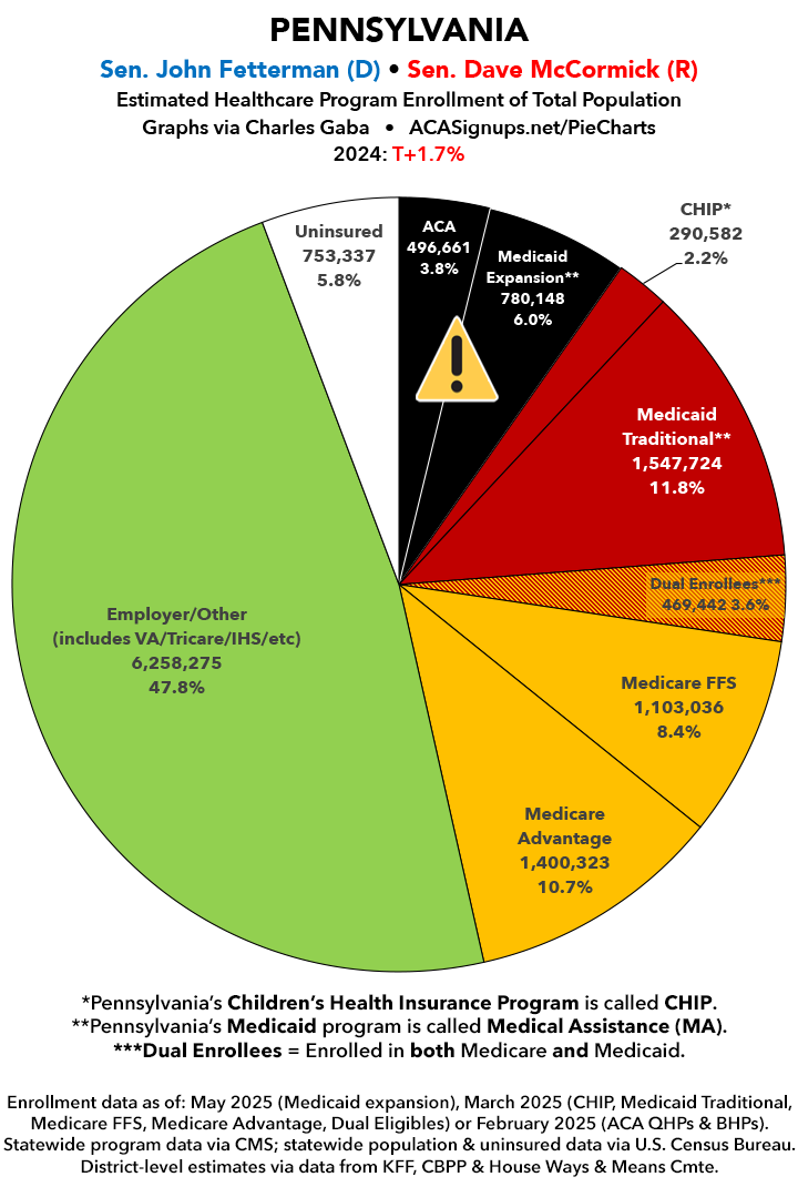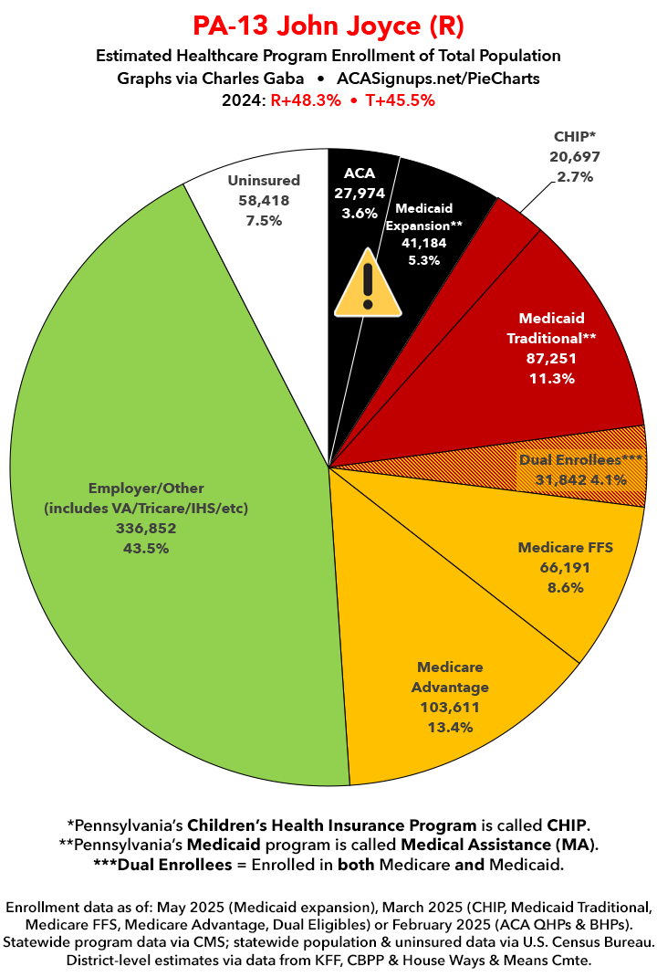 UPDATE 7/11/25: I've updated the web versions of the graphics with the most up-to-date enrollment data I have access to. The black sections w/the ⚠️ symbol are those most at risk of losing healthcare coverage due to H.R. 1, the "One Big Beautiful Bill Act" (aka the #MAGAMurderBill).