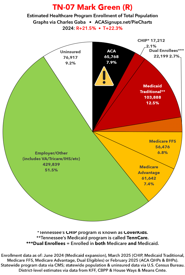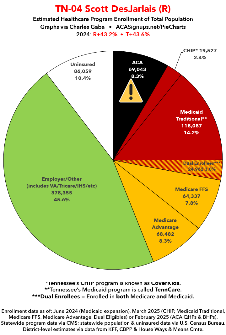 UPDATE 7/11/25: I've updated the web versions of the graphics with the most up-to-date enrollment data I have access to. The black sections w/the ⚠️ symbol are those most at risk of losing healthcare coverage due to H.R. 1, the "One Big Beautiful Bill Act" (aka the #MAGAMurderBill).