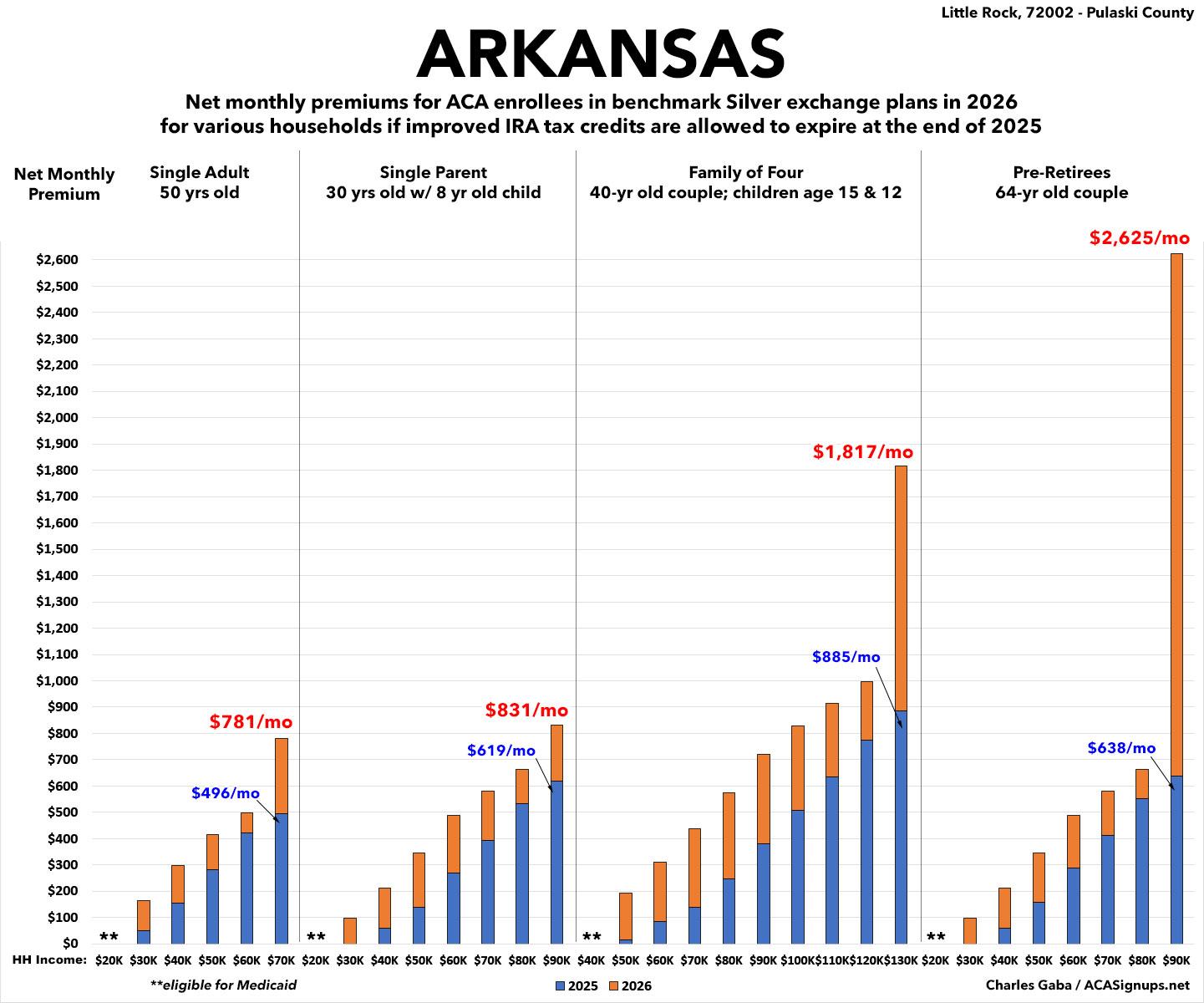 The original version of this analysis included a 4.3% increase in the unsubsidized benchmark plan premium based on a projection by the Congressional Budget Office. However, that was a national average projection which didn’t take into account other factors like increased utilization, medical inflation and so on. This updated version assumes the actual 2026 Arkansas rate filings which average 35.7% statewide.