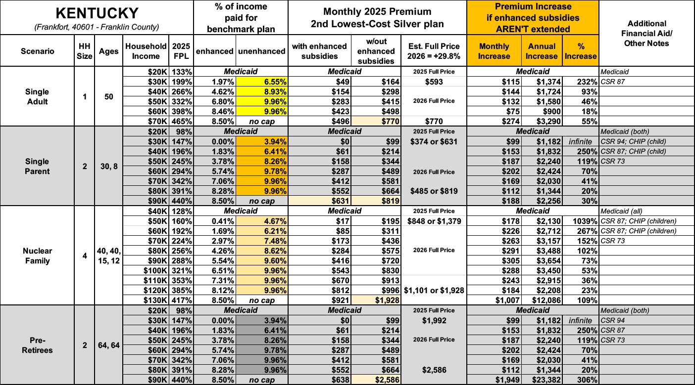 Kentucky has around 97,000 residents enrolled in ACA exchange plans, 86% of whom are currently subsidized. I estimate they also have another ~6,800 unsubsidized off-exchange enrollees.