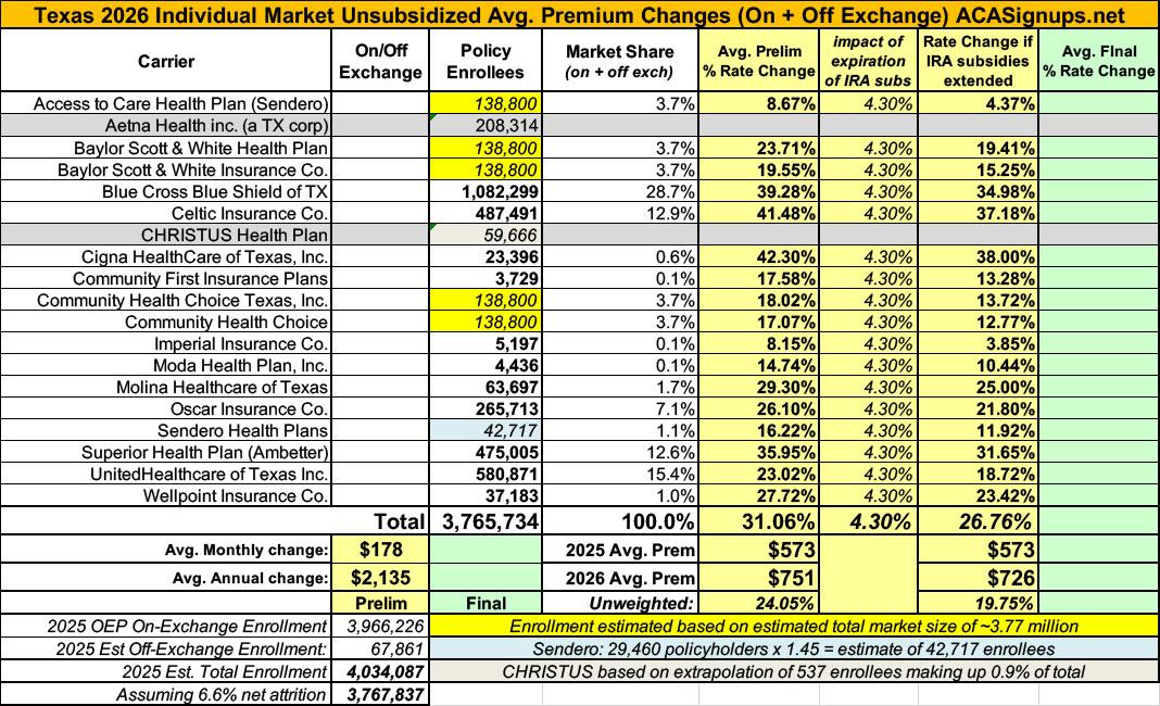 Also, it turns out CHRISTUS is not dropping out of the TX individual market after all; I've filled in their numbers as well.