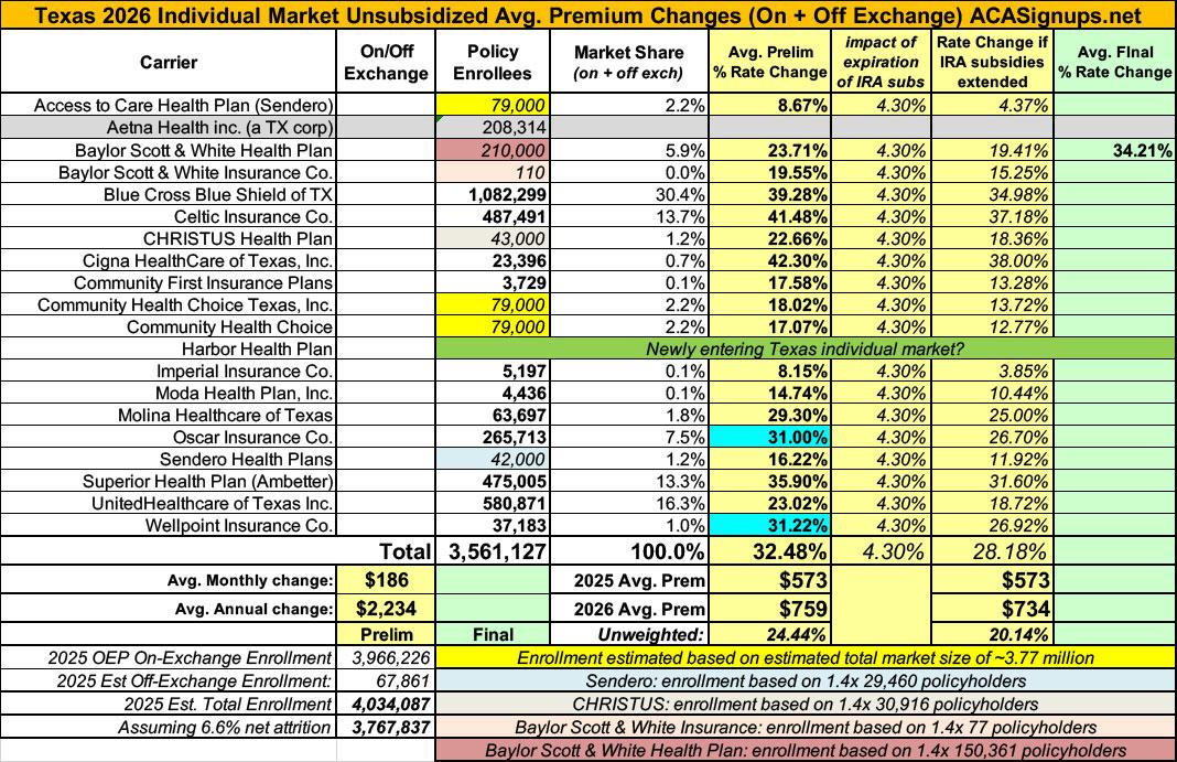 UPDATE 11/02/25: Just hours ahead of Open Enrollment launching, Texas insurance carriers had their final, approved rate filing decisions published to the federal rate review database. In addition to several significant changes to carrier filing averages, I was also able to get the actual enrollment data for two more carriers. Overall, the weighted average rate increase moved up by over two points to +34.7%.