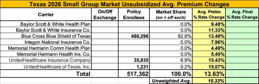 Meanwhile, I have no enrollment data at all for most of the small group carriers; the unweighted average 2026 rate hike there is 10.3%.