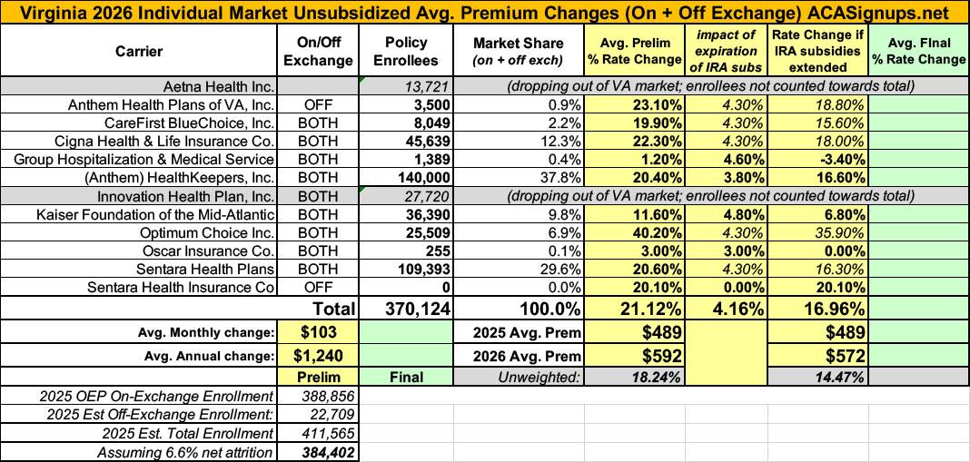 As noted above, both Aetna and Innovation are dropping out of the market; fortunately, both have provided their current enrollment (which is unusual...I'm rarely able to find enrollment data for carriers who are no longer participating). This puts confirmed total VA individual market enrollment at just over 411,000 people, and it means the weighted average preliminary rate increases come in at 21.1% statewide.