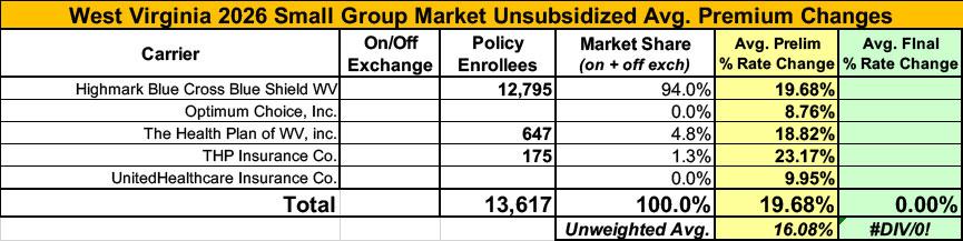 Meanwhile, I have no enrollment data at all for some of the small group carriers; the unweighted average 2026 rate hike there is 16.1%.