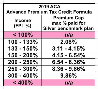 Once again: Under the ACA, if you earn between 100-400% FPL (between $12,140 and $48,560 for a single person), you're eligible for APTC assistance on a sliding scale. The formula is based on the premium for the Silver "benchmark" plan available in your area, which averages around $611/month in 2019.
