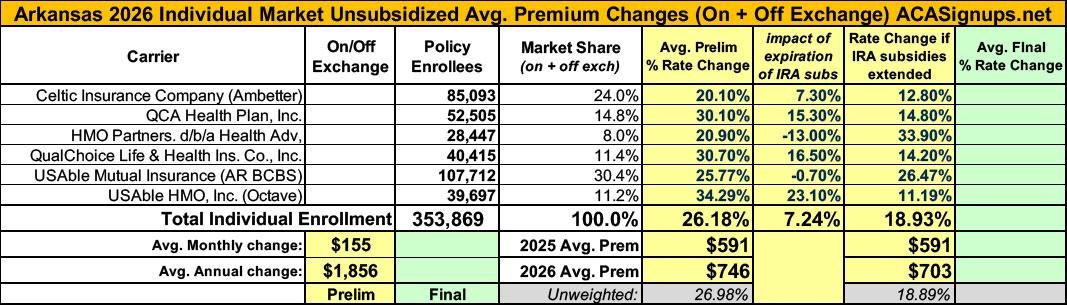Back in July I posted my analysis of the preliminary 2026 rate filings by the 6 Arkansas insurance carriers participating in the individual market. At the time, they looked like this: