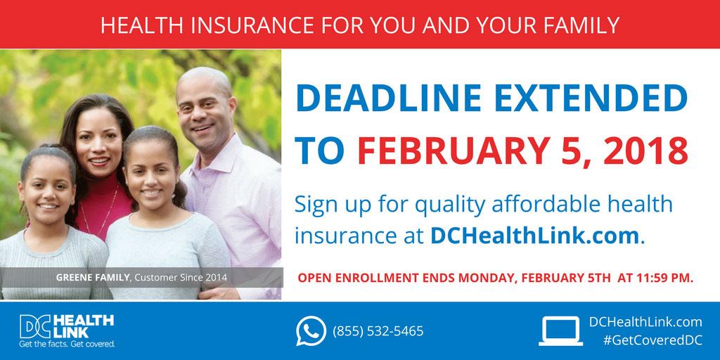 .@MayorBowser has extended the deadline for individuals & families to enroll in quality affordable health insurance to Monday, February 5th at 11:59 pm. Take advantage of today's extended hours at enrollment centers across the city. Don't delay #GetCoveredDCpic.twitter.com/8R7zq0EzA1