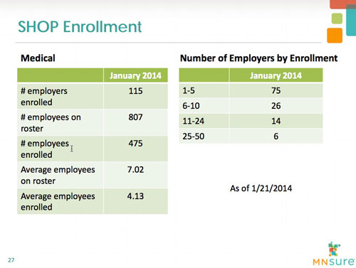 In addition, Minnesota's SHOP (Small Business) exchange tally has gone up a bit as well, to 541 employees covered; multiplying this by a conservative average of 1.8 per employee household brings it up to around 974 people covered by MN SHOP plans.