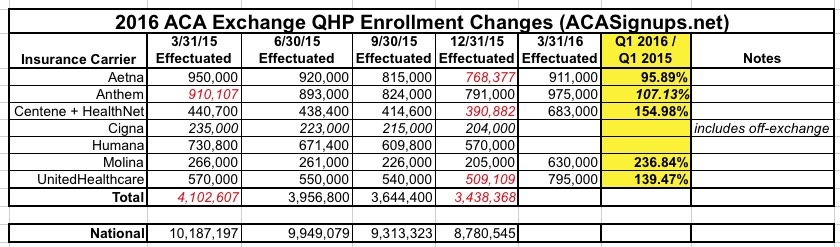 I've used Molina's Q1 2016 report, along with the Q4 2015 reports of Cigna and Humana, to further fill in the "Major Insurer" table I've been working on all this week; here's what it looks like now: