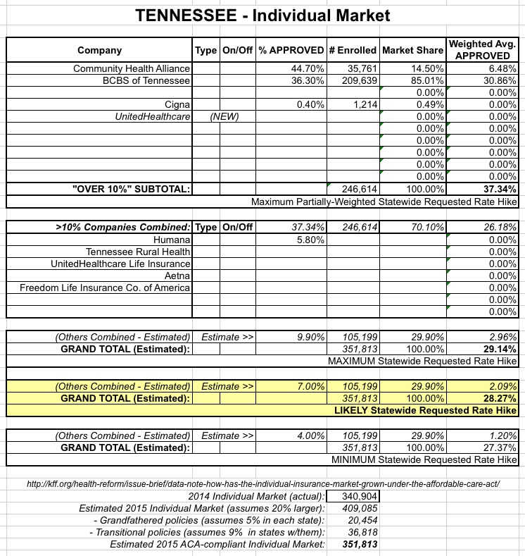 And now you can add Tennessee to the mix. Starting with Louise Norris' exchange-only data (which comes in at a 33% average hike), I've also plugged in additional off-exchange individual market numbers to come up with what looks like an overall average rate hike of around 28.3%: